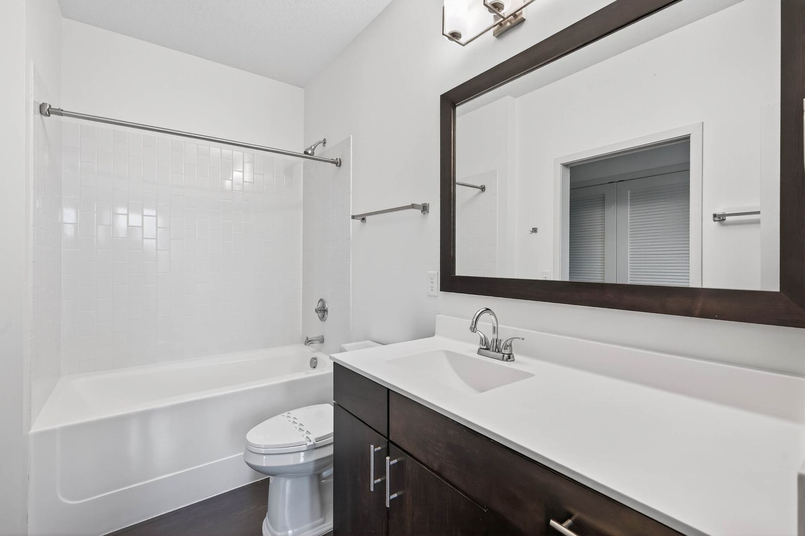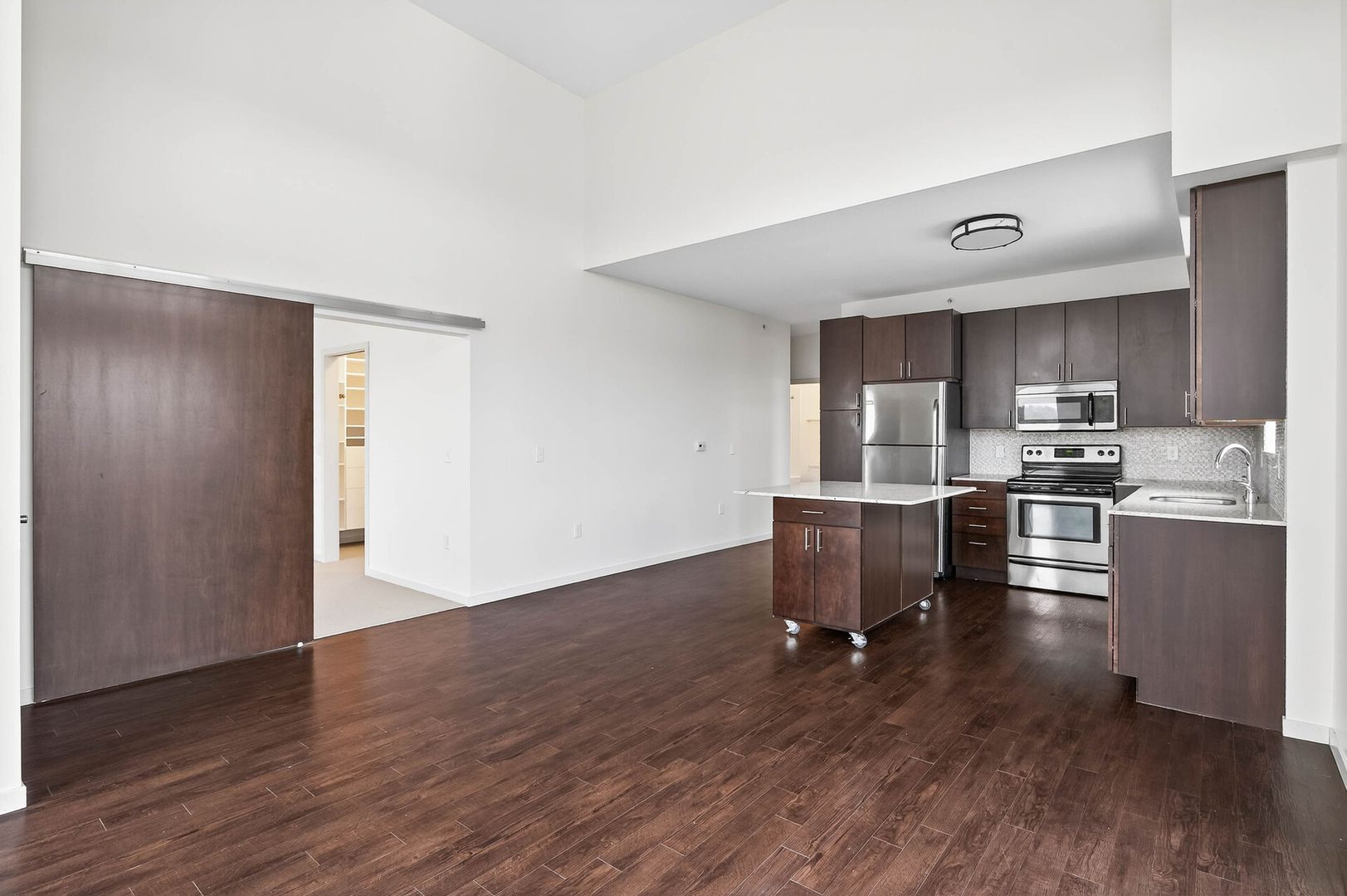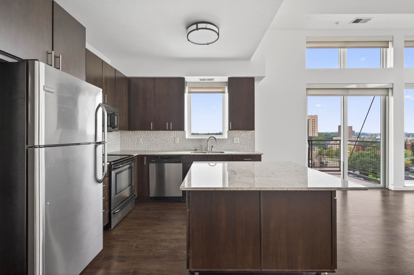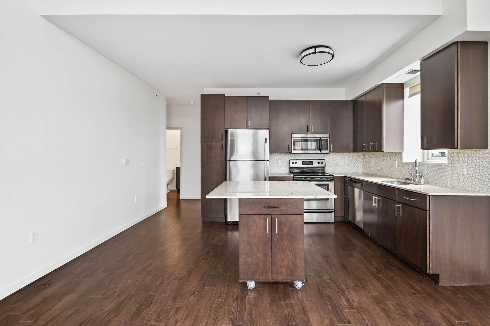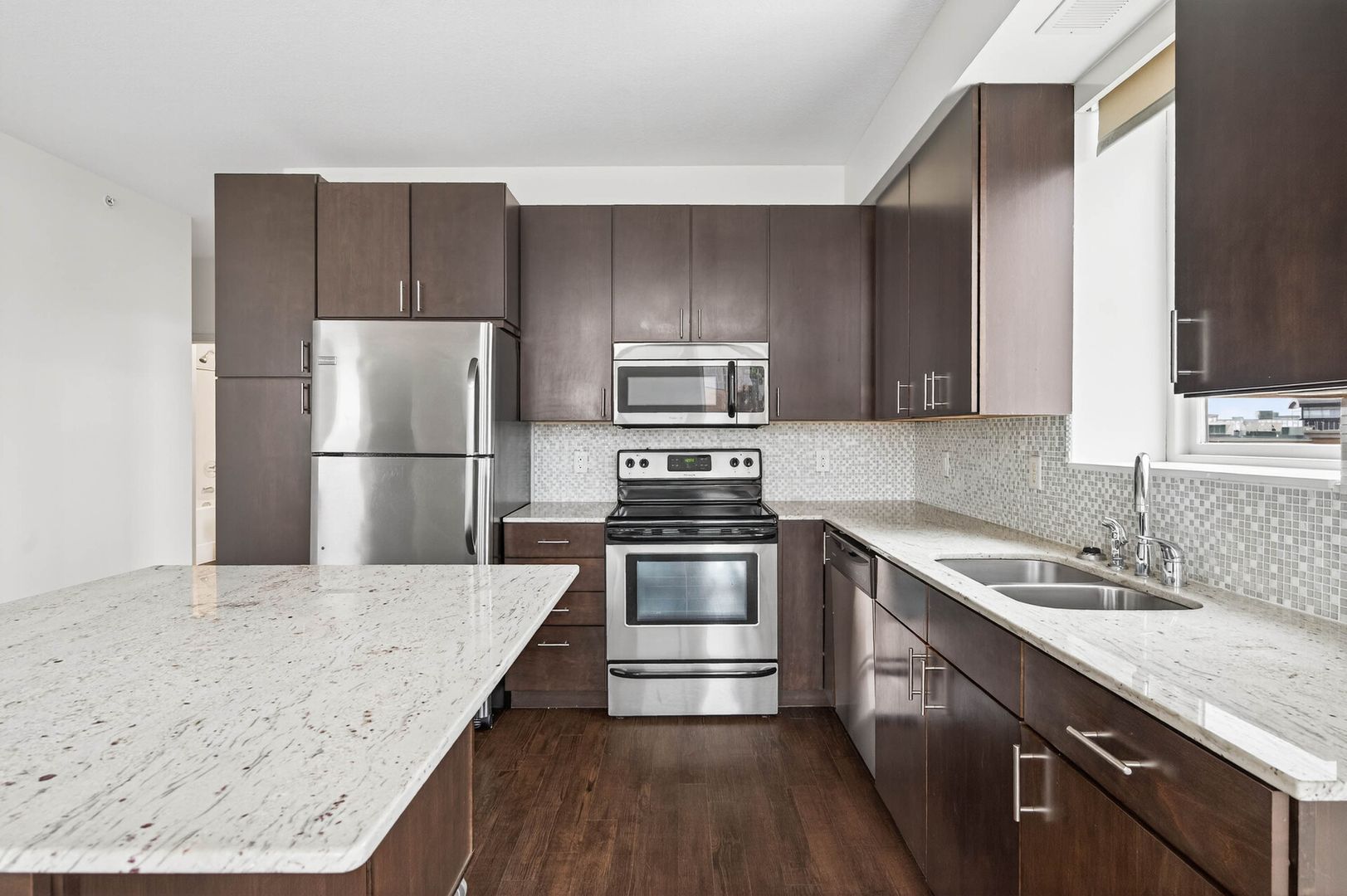 Step into timeless elegance with this beautifully designed apartment, where classic charm meets modern convenience. The heart of the home is the sophisticated gourmet kitchen, featuring rich espresso cabinetry, a glass-tile backsplash, gleaming granite countertops, and a spacious kitchen island—perfect for preparing meals and gathering with loved ones. Stainless steel appliances complement the space, adding both function and style.