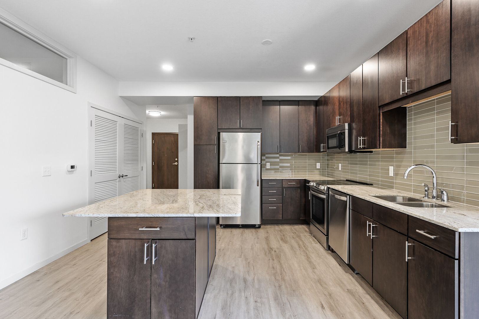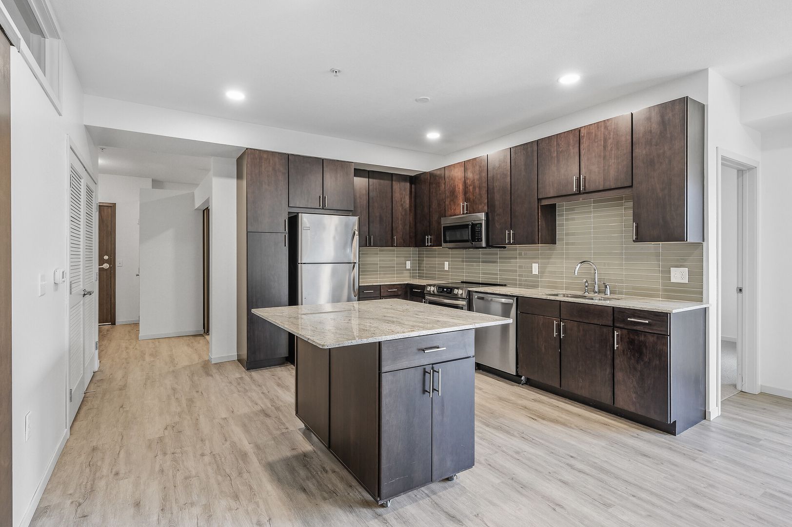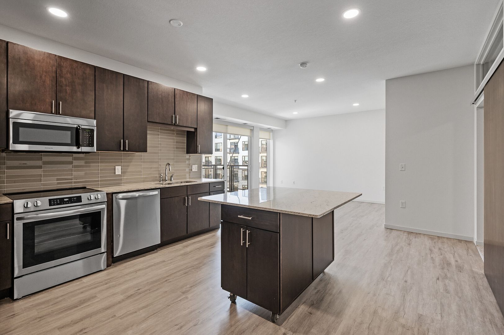 Experience contemporary luxury in this thoughtfully designed apartment, where sleek finishes and modern conveniences create the perfect place to call home. The open-concept kitchen is a statement of style and functionality, featuring rich espresso cabinetry, striking glass-tile backsplash, gleaming granite countertops, and a spacious kitchen island—perfect for cooking, entertaining, or casual dining. The high-end premium appliances package completes the space, blending seamlessly with the modern aesthetic.