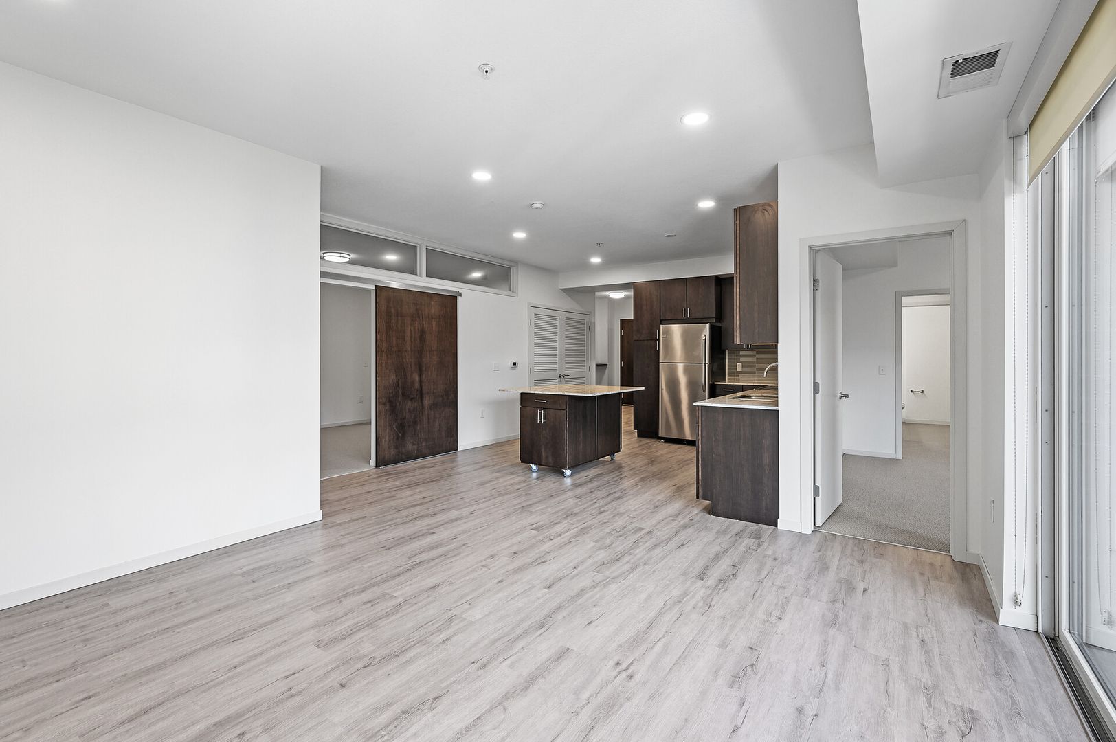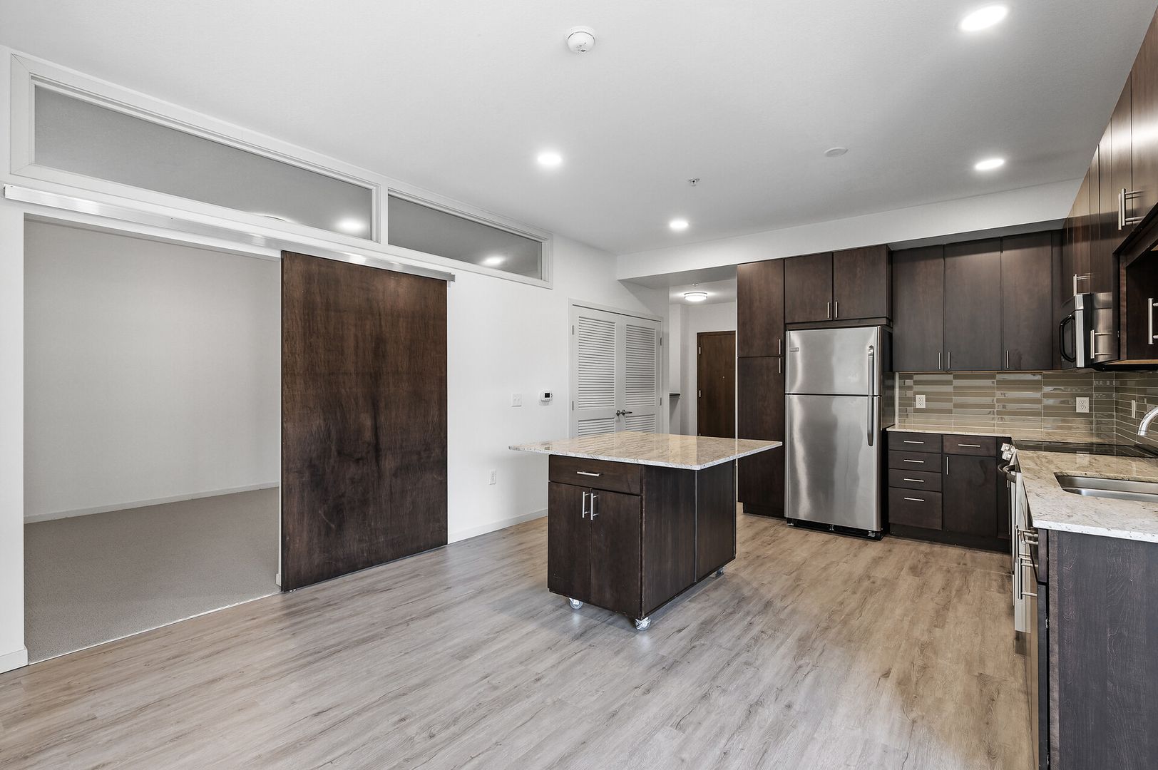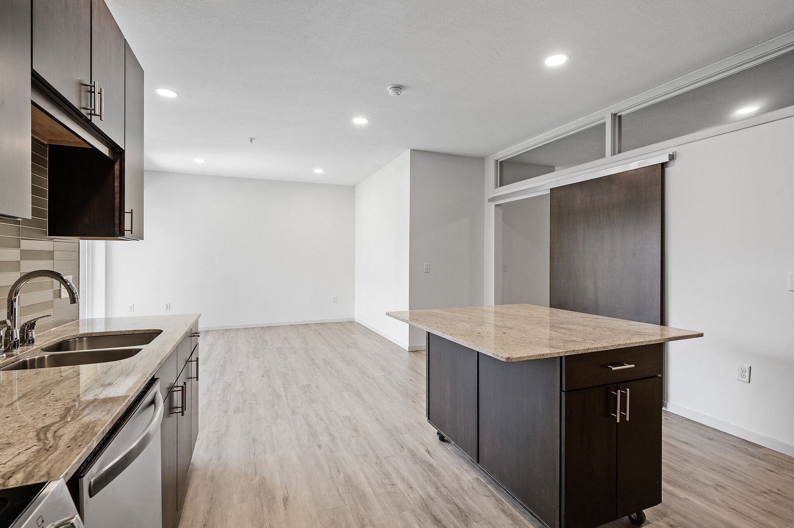 Experience contemporary luxury in this thoughtfully designed apartment, where sleek finishes and modern conveniences create the perfect place to call home. The open-concept kitchen is a statement of style and functionality, featuring rich espresso cabinetry, striking glass-tile backsplash, gleaming granite countertops, and a spacious kitchen island—perfect for cooking, entertaining, or casual dining. The high-end premium appliances package completes the space, blending seamlessly with the modern aesthetic.